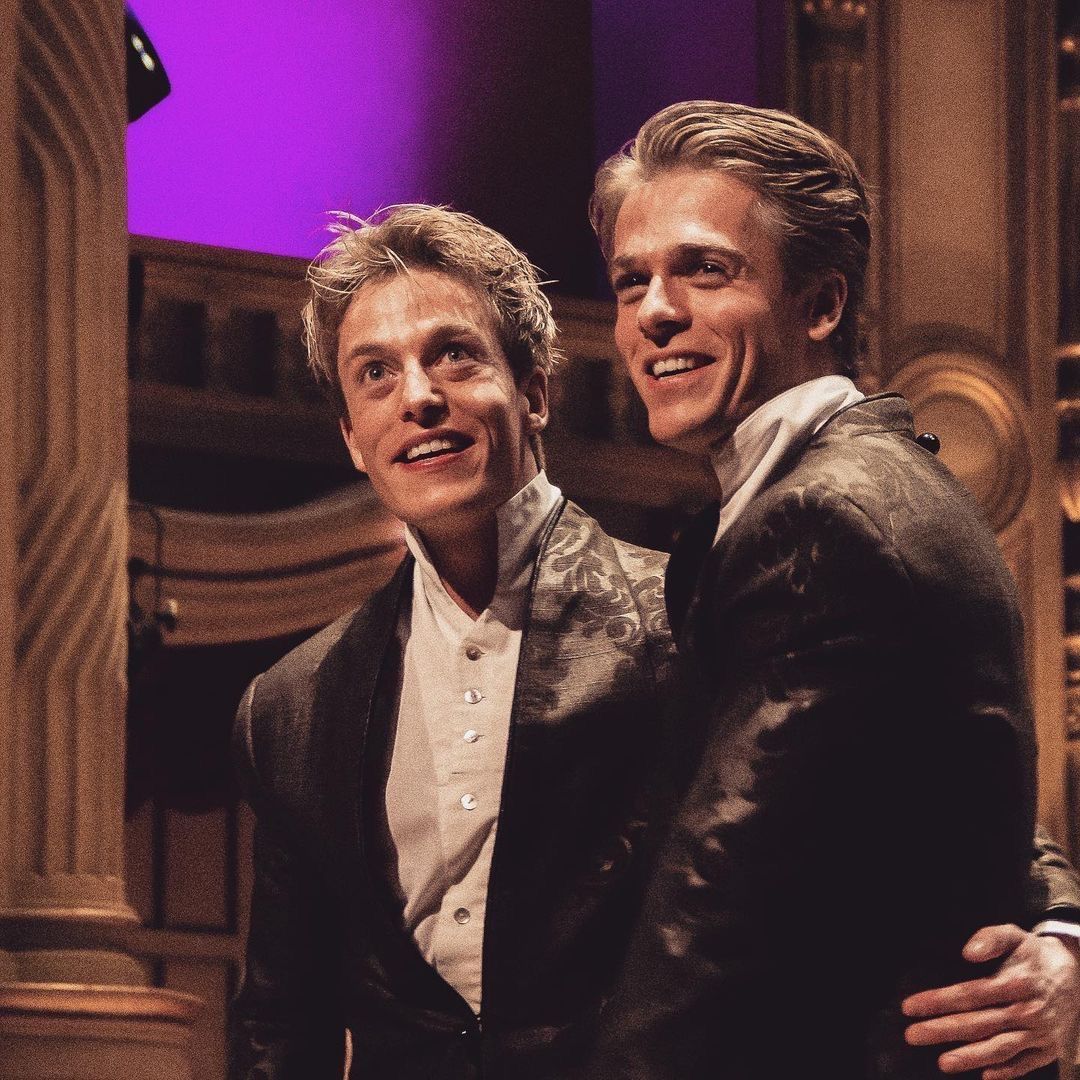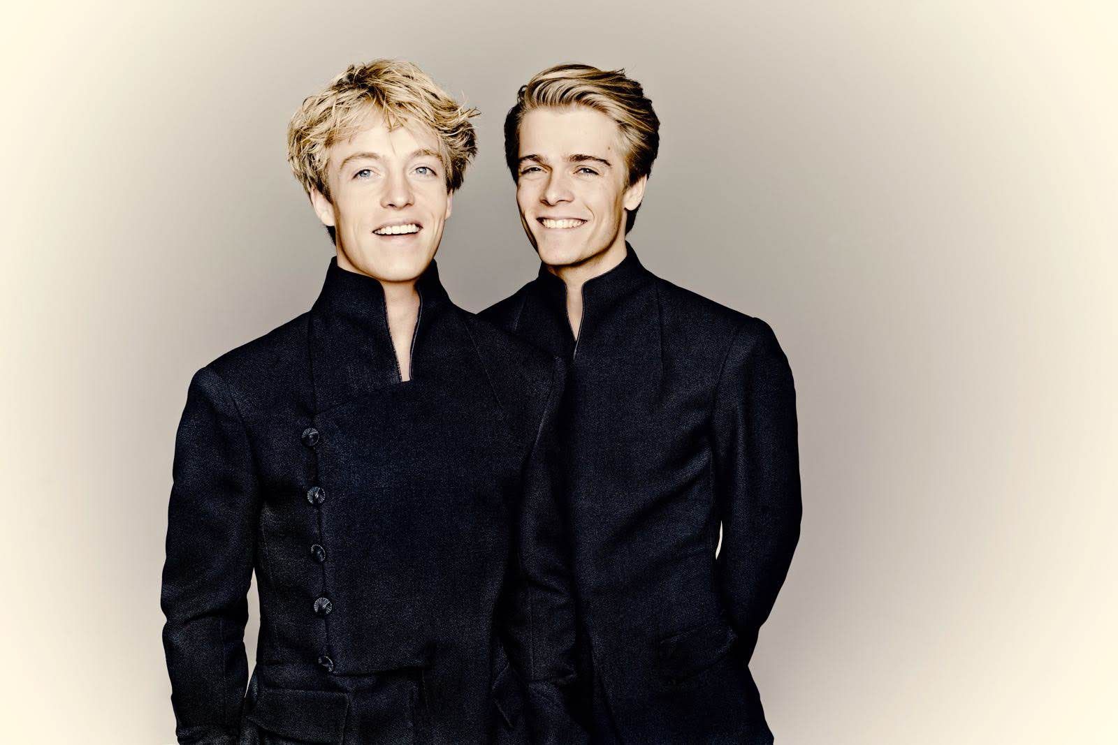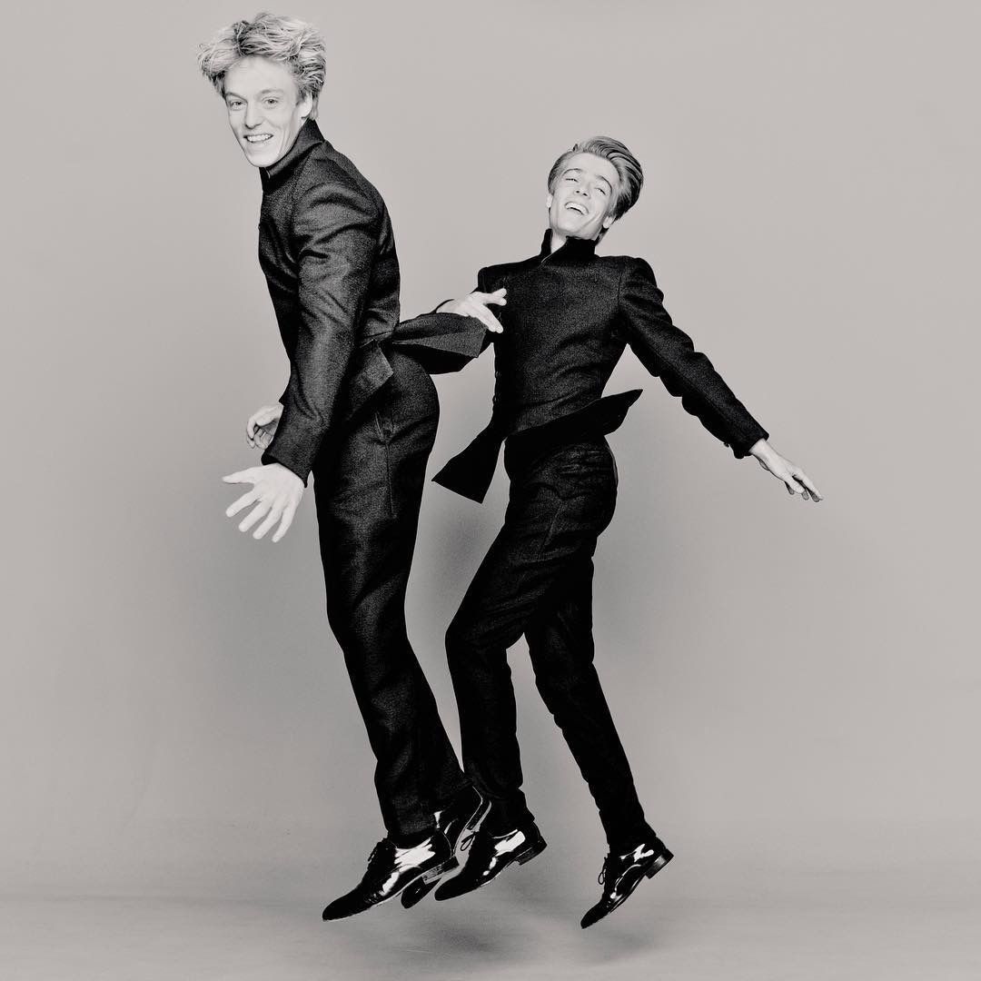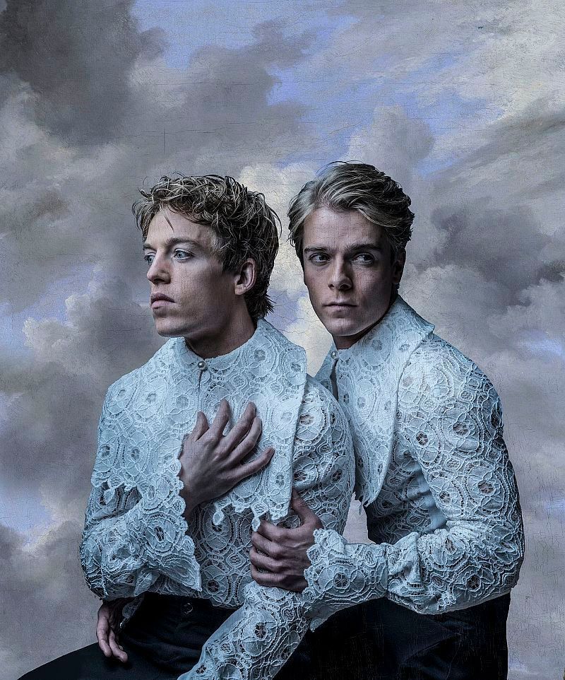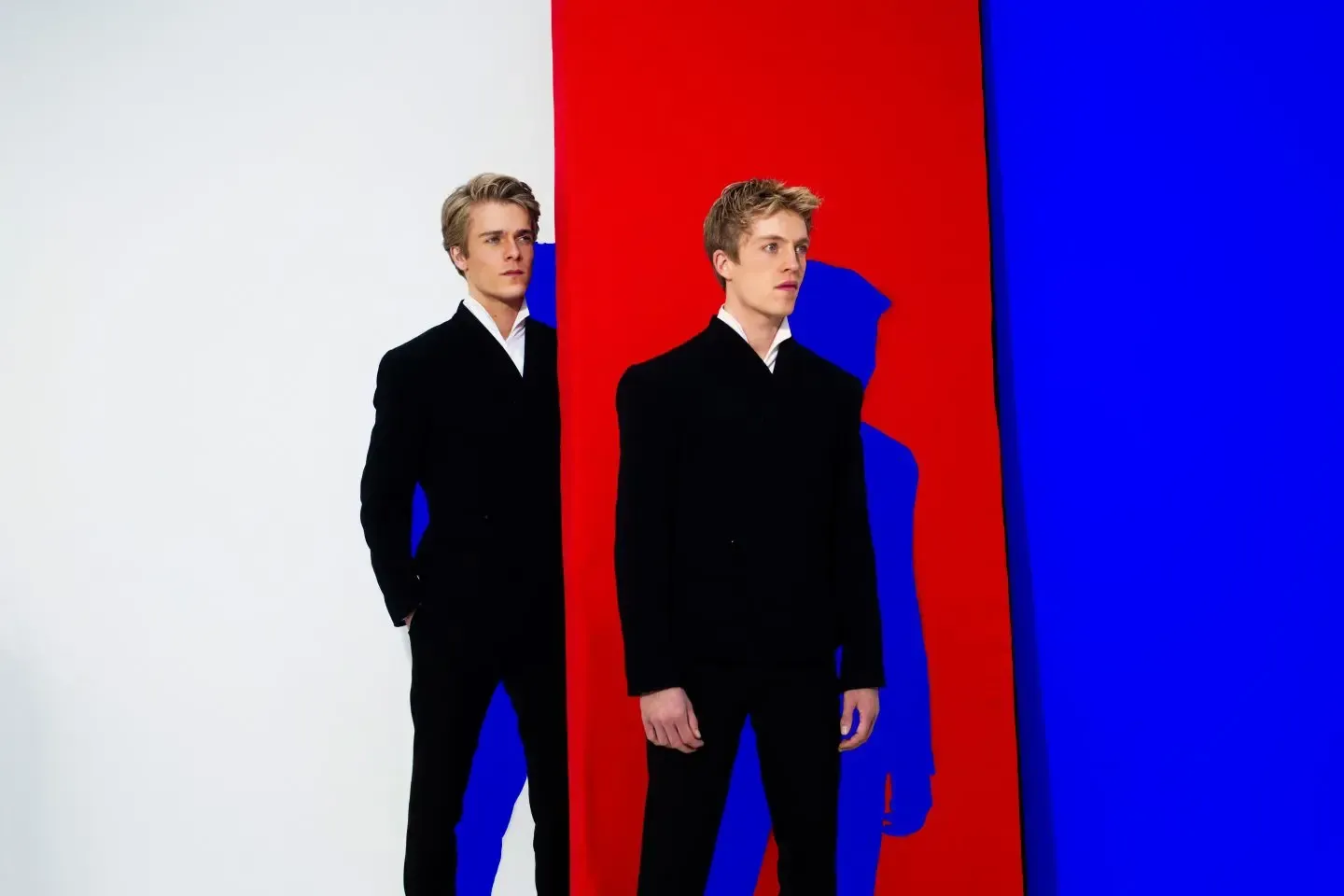 Inspired by this image, a tapestry was conceived, centered around the concentric circle motif. The suits worn by Lucas and Arthur in the photograph were designed to reflect the composition of the background. A key challenge in this design was ensuring that the ensemble, including both the composition and the garments, aligned harmoniously so that all elements would unify and fit.