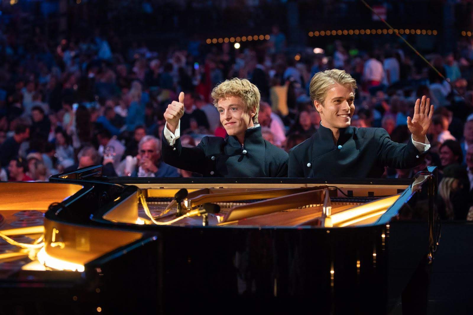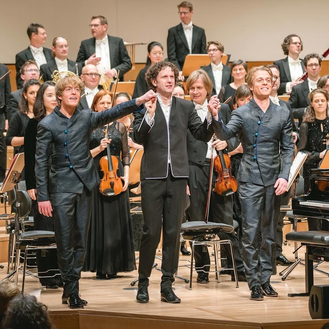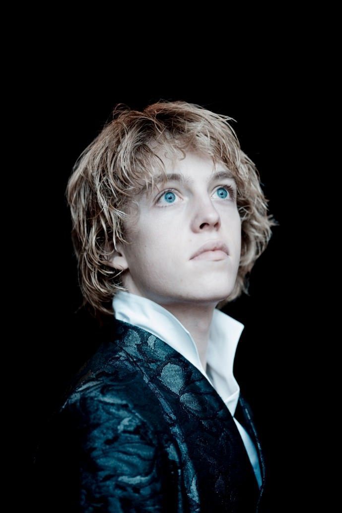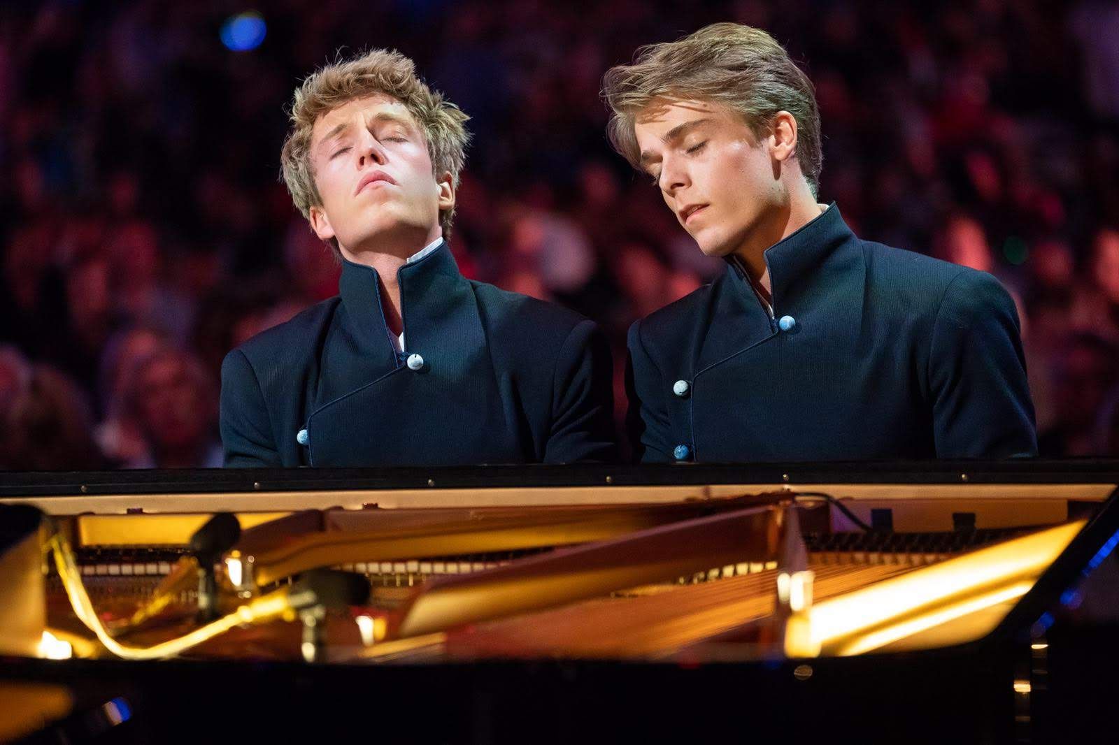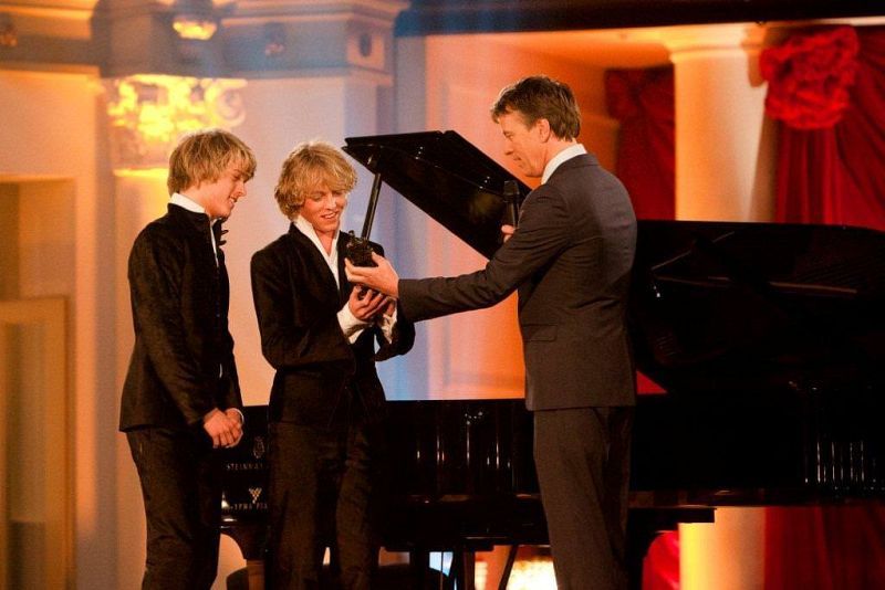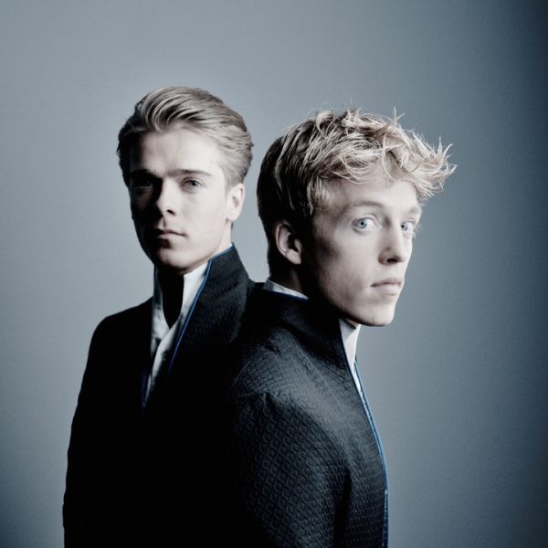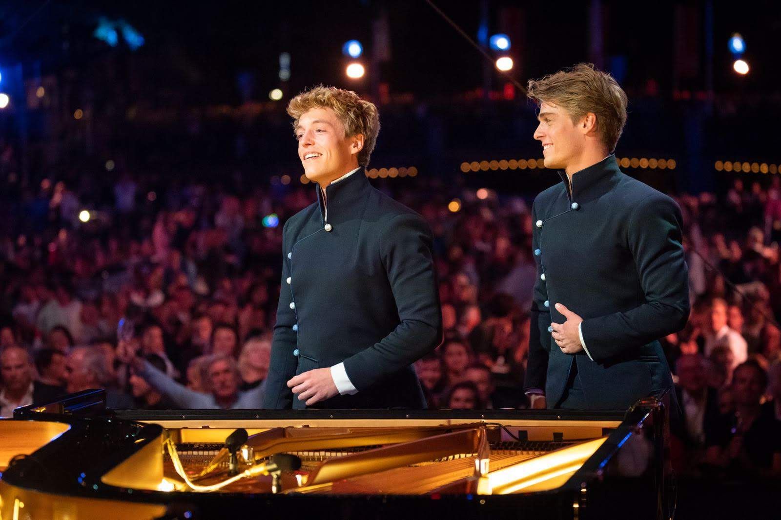 Inspired by this image, a tapestry was conceived, centered around the concentric circle motif. The suits worn by Lucas and Arthur in the photograph were designed to reflect the composition of the background. A key challenge in this design was ensuring that the ensemble, including both the composition and the garments, aligned harmoniously so that all elements would unify and fit.