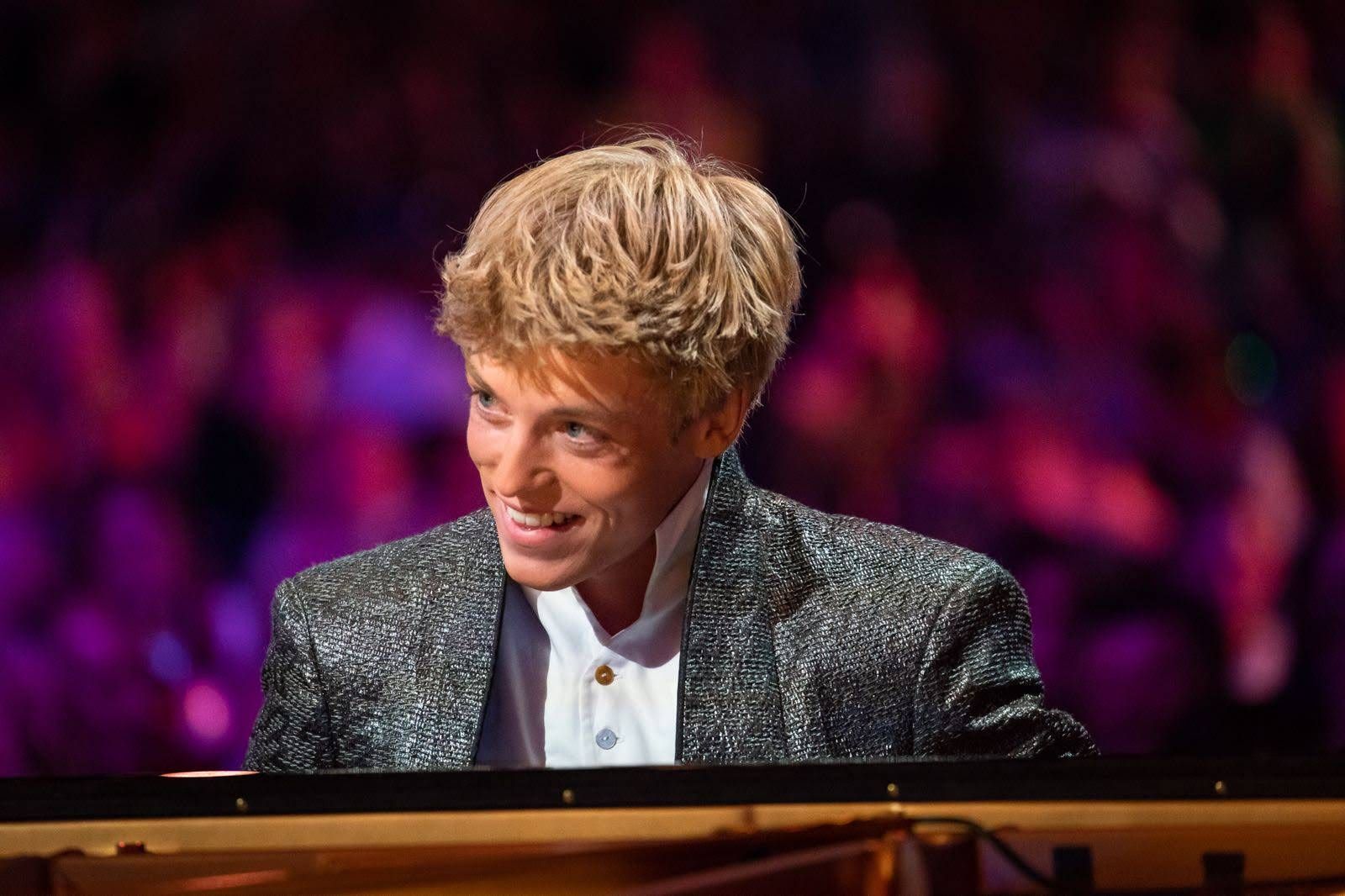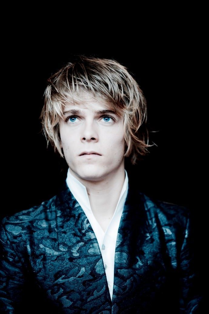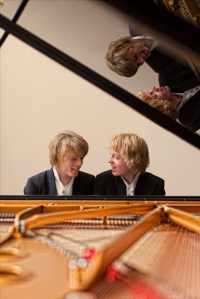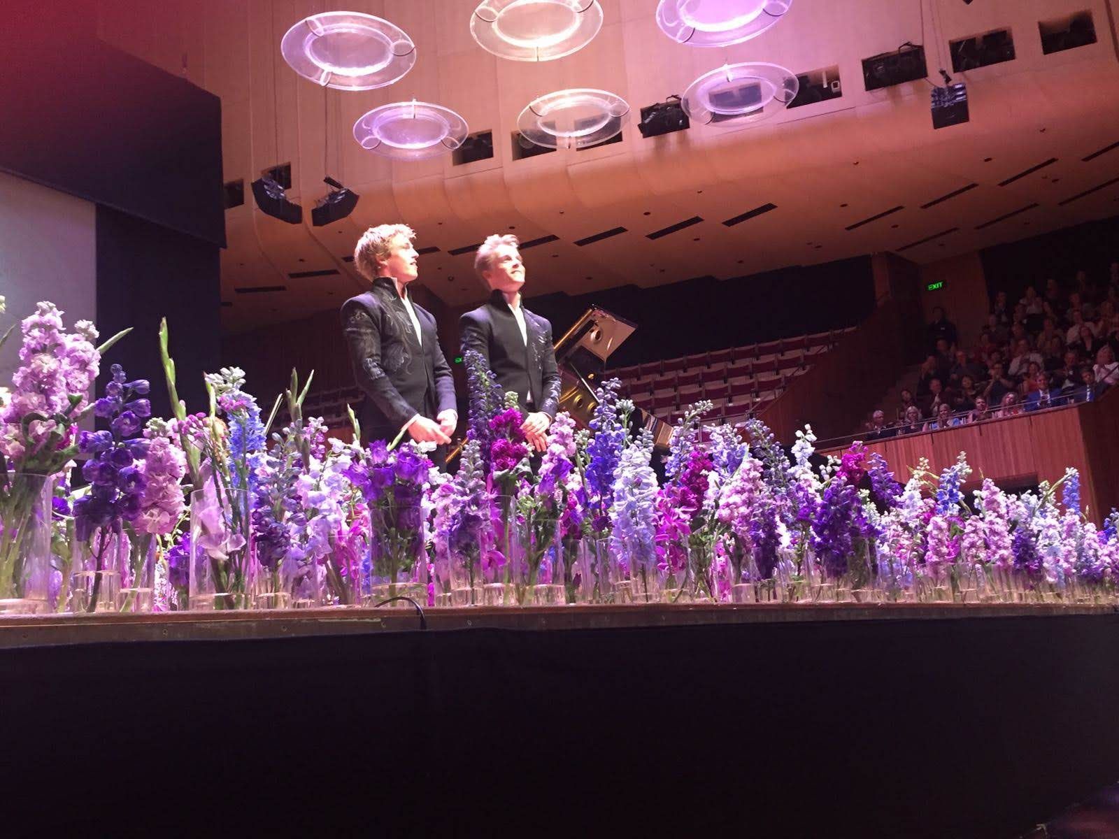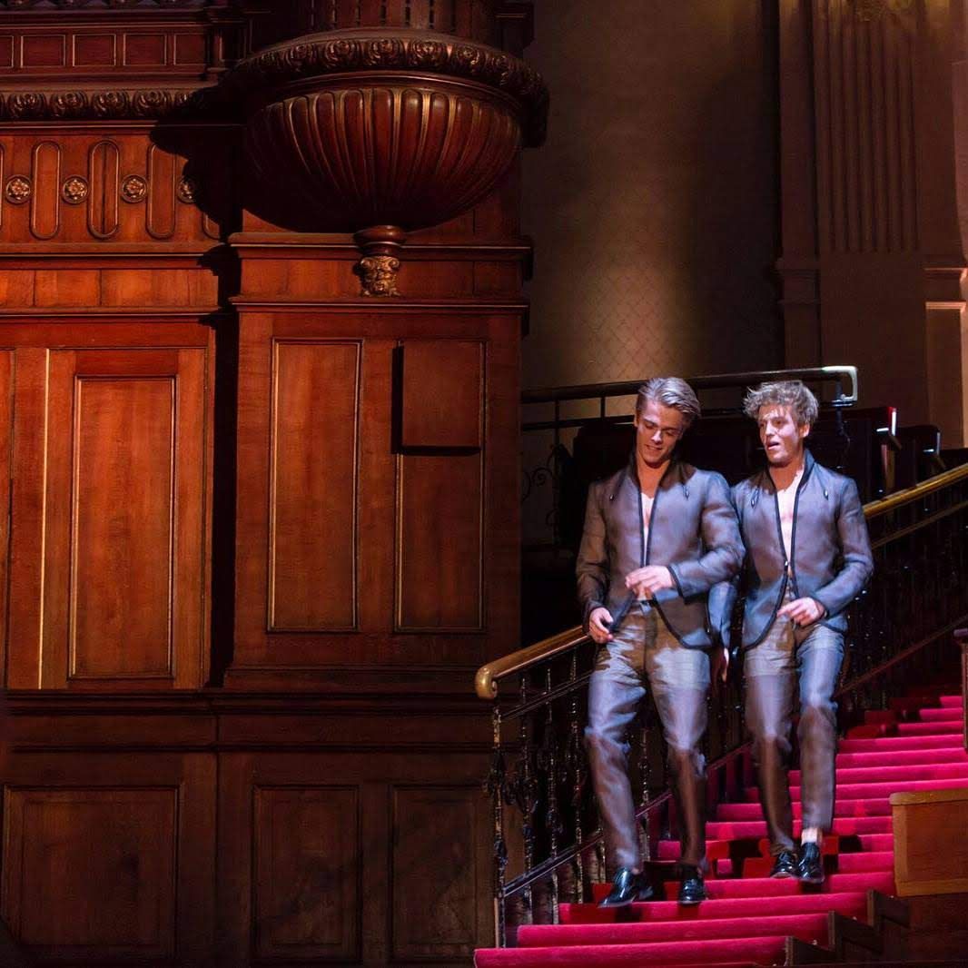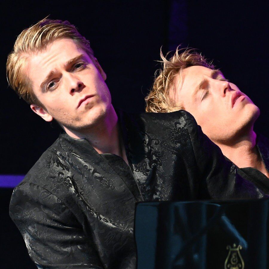 Inspired by this image, a tapestry was conceived, centered around the concentric circle motif. The suits worn by Lucas and Arthur in the photograph were designed to reflect the composition of the background. A key challenge in this design was ensuring that the ensemble, including both the composition and the garments, aligned harmoniously so that all elements would unify and fit.