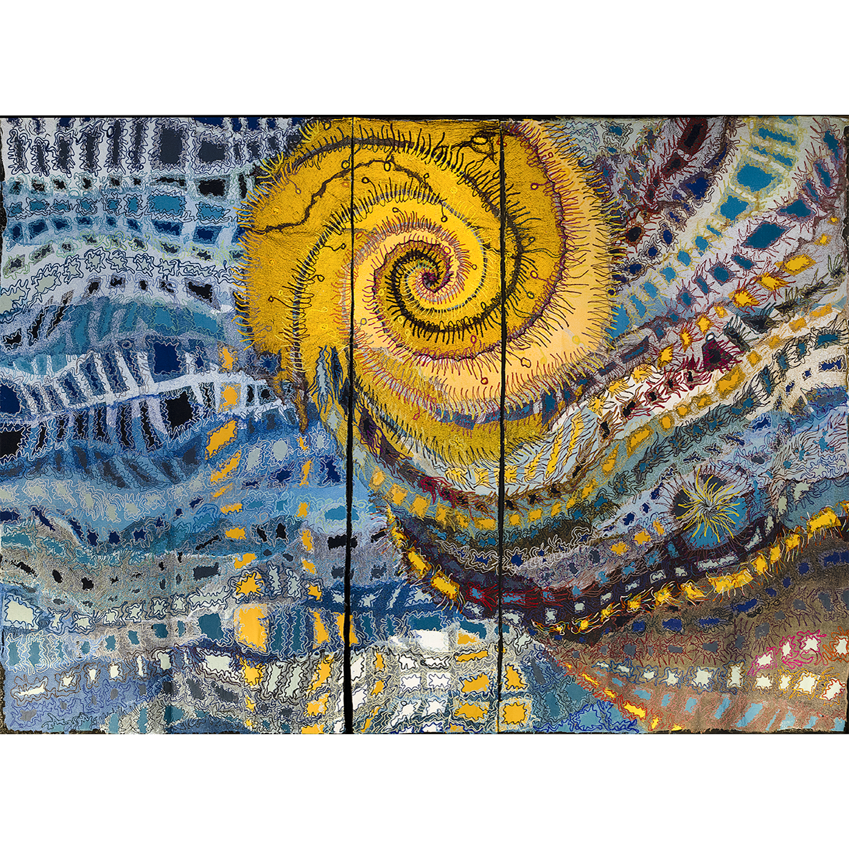 Originally conceived for Verdi's I Due Foscari by Opera St Moritz and Opera Basel, Das Licht in der Laguna is a monumental 22-metre, five-part tapestry series that reflects on Venice's historical gravitas and ecological fragility. Executed entirely by hand using traditional needle-felting techniques, the work translates the ephemeral qualities of water, air and light into textured wool surfaces.