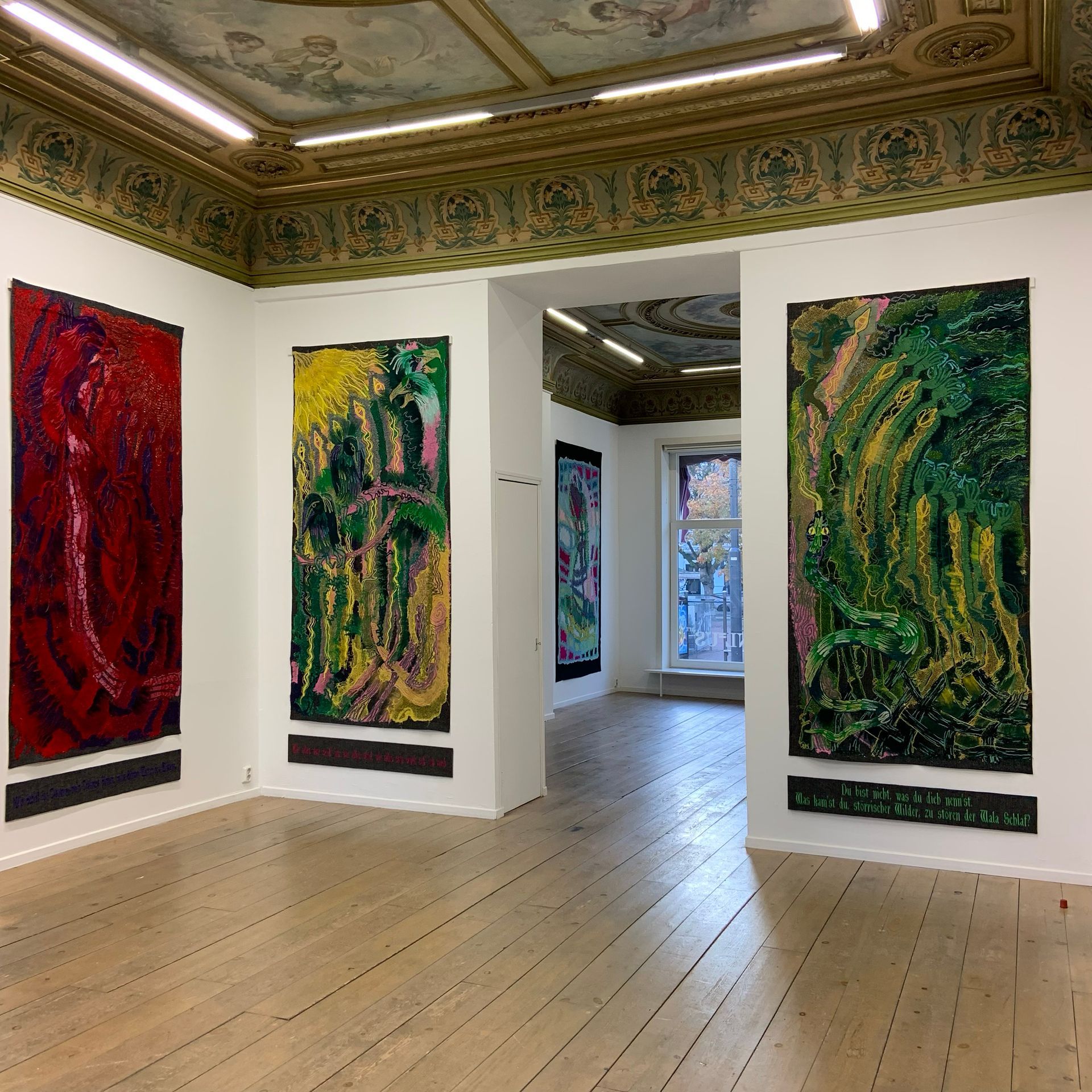 Asphodel Meadows – tapestries and couture pieces reinvent a mythic paradise with vivid colours evoking seasonal change, while confronting pressing climate concerns through the spectre of the ash-filled fields of its Odyssean version.