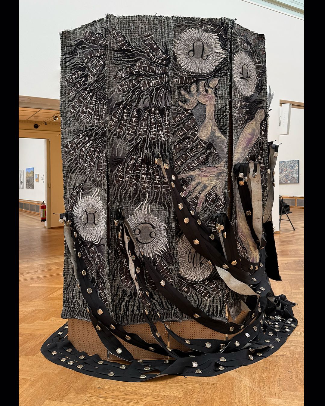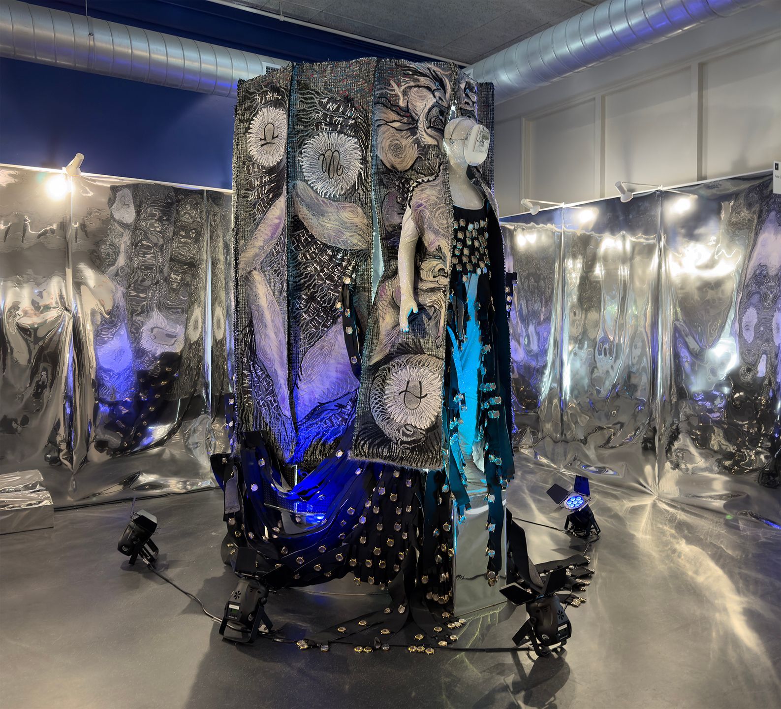 Locus Classicus is a three-part, circular textile installation on time: temporal fields at once participatory, reflective, linear and simultaneous. At its centre stands Aion, embodied as a wearable sculpture of cloth strips and empty timepieces. Viewers are invited to mark their own place in time by inserting medallions that commemorate the most recent birth and death within their lives. The installation is framed by a twelve-panel tapestry, where the masculine and feminine appear as storied dual forces of life and death, and is shaped by a Kozyrev Mirror, a device said to distort space and time. Together, Locus Classicus offers an altered view of time that echoes Thomas Carlyle’s words: “All nature and life are one living garment, woven and ever-a-weaving in the loom of time.”