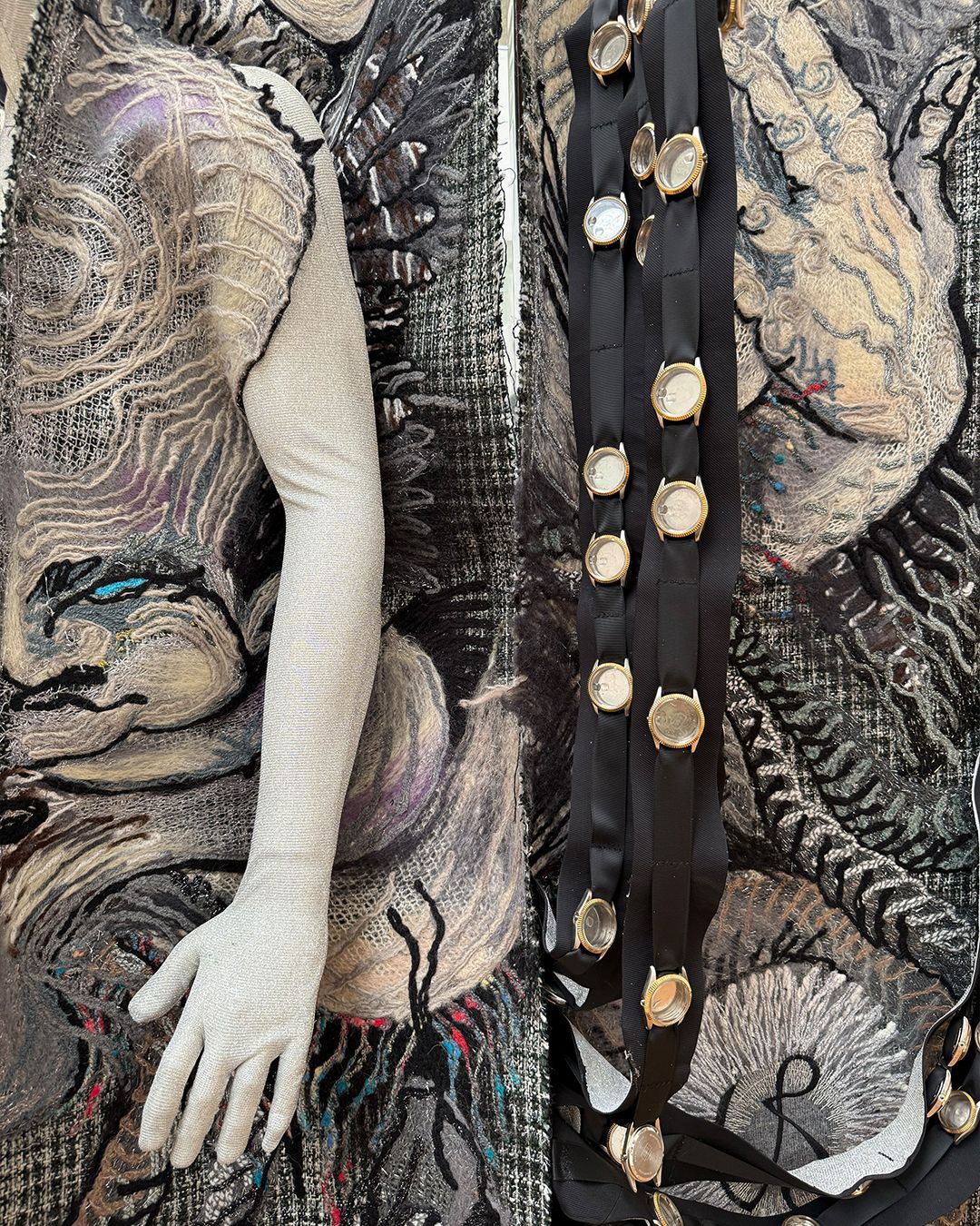 At the heart of the installation stands Aion, a Hellenistic deity representing unbounded time. A sartorial statue composed of long, linear strips of cloth overlaid with empty timepieces, symbols of temporal passage and absence. These strips and voided watch faces represent the crossing of life threads: the seen and the unseen, the living and the dead.